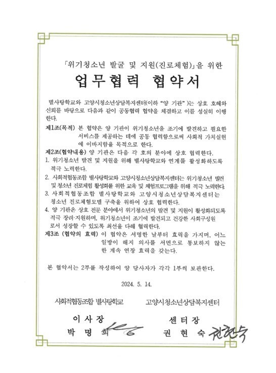 별사탕학교, 고양시청소년상담복지센터와 업무협약체결-위기청소년발굴, 진로체험 기회제공